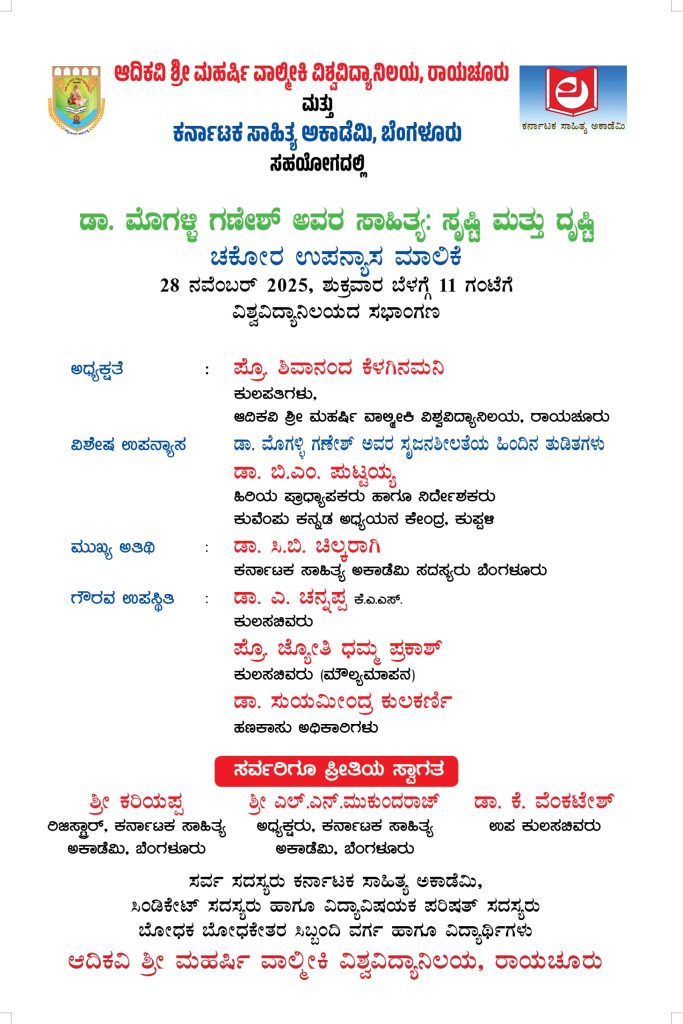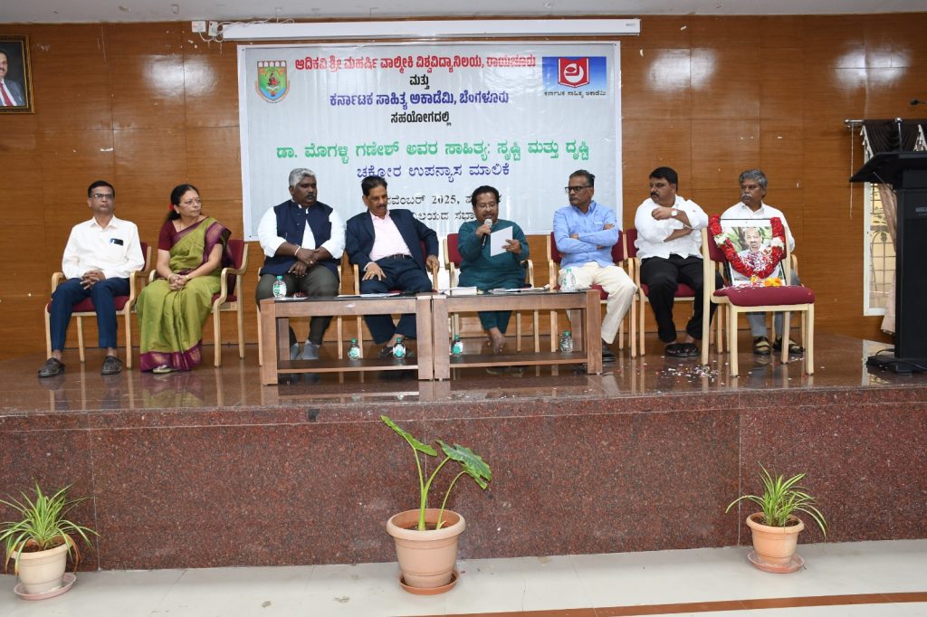 ದಿನಾಂಕ: ೨೮.೧೧.೨೦೨೫ ರಂದು ಆದಿಕವಿ ಶ್ರೀ ಮಹರ್ಷಿ ವಾಲ್ಮೀಕಿ ವಿಶ್ವವಿದ್ಯಾನಿಲಯ ಮತ್ತು ಬೆಂಗಳೂರಿನ ಕರ್ನಾಟಕ ಸಾಹಿತ್ಯ ಅಕಾಡೆಮಿ ಸಹಯೋಗದಲ್ಲಿ ಡಾ. ಮೊಗಳ್ಳಿ ಗಣೇಶ್ ಅವರ ಸಾಹಿತ್ಯ: ಸೃಷ್ಟಿ ಮತ್ತು ದೃಷ್ಟಿ ಚಕೋರ ಉಪನ್ಯಾಸ ಮಾಲಿಕೆಯನ್ನು ವಿಶ್ವವಿದ್ಯಾನಿಲಯದ ಸಭಾಂಗಣದಲ್ಲಿ ಶುಕ್ರವಾರ ಹಮ್ಮಿಕೊಳ್ಳಲಾಯಿತು. ಡಾ. ಮೊಗಳ್ಳಿ ಗಣೇಶ್ ಅವರ ಭಾವಚಿತ್ರಕ್ಕೆ ಪುಷ್ಪ ನಮನ ಸಲ್ಲಿಸಿ ಮಾತನಾಡಿದರು, ಈ ಸಂದರ್ಭದಲ್ಲಿ ಕುಪ್ಪಳ್ಳಿಯ ಕುವೆಂಪು ಕನ್ನಡ ಅಧ್ಯಯನ ಕೇಂದ್ರದ ಹಿರಿಯ ಪ್ರಾಧ್ಯಾಪಕರು ಹಾಗೂ ನಿರ್ದೇಶಕರಾದ ಡಾ.ಬಿ.ಎಂ.ಪುಟ್ಟಯ್ಯ ಅವರು ವಿಶೇಷ ಉಪನ್ಯಾಸ ನೀಡಿದರು. ಕಾರ್ಯಕ್ರಮದ ಅಧ್ಯಕ್ಷತೆ ವಹಿಸಿದ್ದ ವಾಲ್ಮೀಕಿ ವಿಶ್ವವಿದ್ಯಾನಿಲಯದ ಕುಲಪತಿಗಳಾದ ಪ್ರೊ.ಶಿವಾನಂದ ಕೆಳಗಿನಮನಿ ಅವರು, ಮುಖ್ಯ ಅತಿಥಿಗಳಾಗಿ ಬೆಂಗಳೂರಿನ ಕರ್ನಾಟಕ ಸಾಹಿತ್ಯ ಅಕಾಡೆಮಿಯ ಸದ್ಯಸರಾದ ಡಾ.ಸಿ.ಬಿ.ಚಿಲ್ಕರಾಗಿ, ಕಾರ್ಯಕ್ರಮದಲ್ಲಿ ಕುಲಸಚಿವರು (ಮೌಲ್ಯಮಾಪನ) ಡಾ.ಜ್ಯೋತಿ ದಮ್ಮ ಪ್ರಕಾಶ್, ಉಪ ಕುಲಸಚಿವರಾದ ಡಾ.ಕೆ.ವೆಂಕಟೇಶ್, ವಿವಿಧ ನಿಕಾಯಗಳ ಡೀನರುಗಳಾದ ಪ್ರೊ.ಪಾರ್ವತಿ ಸಿ.ಎಸ., ಪ್ರೊ.ಪಿ.ಭಾಸ್ಕರ್, ಡಾ.ಲತಾ ಎಂ.ಎಸ್., ವಿದ್ಯಾರ್ಥಿ ಕಲ್ಯಾಣ ಅಧಿಕಾರಿ ಡಾ.ಜಿ.ಎಸ್.ಬಿರಾದಾರ, ವಿವಿಧ ವಿಭಾಗಗಳ ಉಪನ್ಯಾಸಕರು, ವಿದ್ಯಾರ್ಥಿಗಳು ಉಪಸ್ಥಿತರಿದ್ದರು.