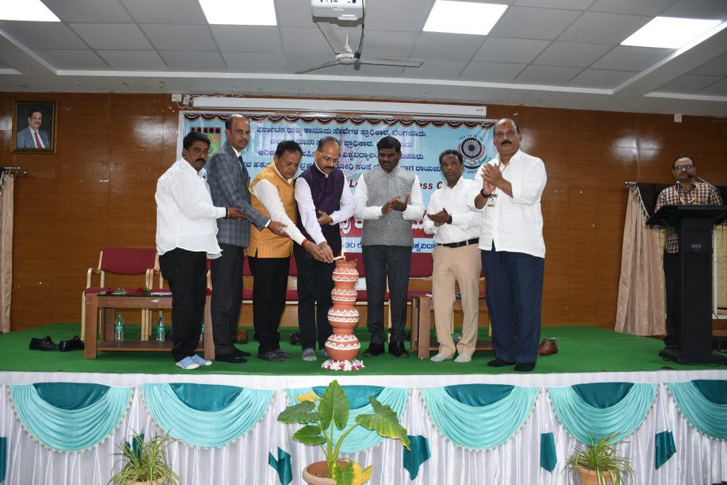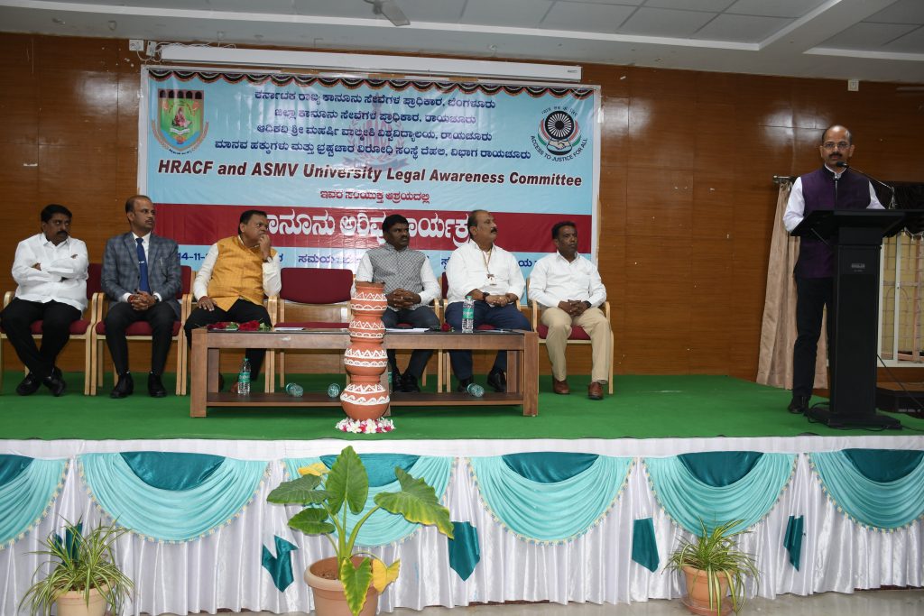 ದಿನಾಂಕ ೧೪.೧೧.೨೦೨೫ ರಂದು ಆದಿಕವಿ ಶ್ರೀ ಮಹರ್ಷಿ ವಾಲ್ಮೀಕಿ ವಿಶ್ವವಿದ್ಯಾನಿಲಯದ ಸಭಾಂಗಣದಲ್ಲಿ ಶುಕ್ರವಾರದಂದು ಹಮ್ಮಿಕೊಂಡಿದ್ದ ಬೆಂಗಳೂರಿನ ಕರ್ನಾಟಕ ರಾಜ್ಯ ಕಾನೂನು ಸೇವೆಗಳ ಪ್ರಾಧಿಕಾರ ಮತ್ತು ರಾಯಚೂರಿನ ಜಿಲ್ಲಾ ಕಾನೂನು ಸೇವೆಗಳ ಪ್ರಾಧಿಕಾರ ಹಾಗೂ ರಾಯಚೂರು ವಿಭಾಗದ ಮಾನವ ಹಕ್ಕುಗಳ ಮತ್ತು ಭ್ರಷ್ಟಾಚಾರ ವಿರೋಧಿ ಸಂಸ್ಥೆ ದೆಹಲಿ ಮತ್ತು ಎಚ್.ಆರ್.ಎ.ಸಿ.ಎಫ್ ಮತ್ತು ವಾಲ್ಮೀಕಿ ವಿಶ್ವವಿದ್ಯಾನಿಲಯದ ಲೀಗಲ್ ಅವೇರ್ನೆಸ್ ಕಮಿಟಿ ಇವರ ಸಂಯುಕ್ತ ಆಶ್ರಯದಲ್ಲಿ ಕಾನೂನು ಅರಿವು ಕಾರ್ಯಕ್ರಮ ಉದ್ಘಾಟಿಸಿದ ಕರ್ನಾಟಕದ ರಾಜ್ಯ ಕಾನೂನು ಸೇವೆಗಳ ಪ್ರಾಧಿಕಾರದ ಸದಸ್ಯ ಕಾರ್ಯದರ್ಶಿಗಳು, ಜಿಲ್ಲಾ ಮತ್ತು ಸೆಷನ್ಸ್ ನ್ಯಾಯಾಧೀಶರಾದ ಶಶಿಧರ್ ಶೆಟ್ಟಿ, ಕಾರ್ಯಕ್ರಮದ ಅಧ್ಯಕ್ಷತೆ ವಹಿಸಿದ್ದ ವಾಲ್ಮೀಕಿ ವಿಶ್ವವಿದ್ಯಾನಿಲಯದ ಕುಲಸಚಿವರಾದ ಡಾ.ಎ.ಚನ್ನಪ್ಪ ಕೆ.ಎ.ಎಸ್., ಮುಖ್ಯ ಅತಿಥಿಗಳಾಗಿ ಕರ್ನಾಟಕ ರಾಜ್ಯ ಕಾನೂನು ಸೇವೆಗಳ ಪ್ರಾಧಿಕಾರದ ಸದಸ್ಯರು ಮತ್ತು ಎಚ್ ಆರ್ ಏ ಸಿ ಎಫ್ ರಾಷ್ಟ್ರೀಯ ಅಧ್ಯಕ್ಷರಾದ ಡಾ.ಮೋಹನ್ ರಾವ್ ನಾಲ್ವಡೆ, ಮತ್ತೋರ್ವ ಮುಖ್ಯ ಅತಿಥಿಗಳಾಗಿ ಕರ್ನಾಟಕ ರಾಜ್ಯ ಕಾನೂನು ಸೇವೆಗಳ ಪ್ರಾಧಿಕಾರದ ಪಿ.ಆರ್.ಓ ಮತ್ತು ಹಿರಿಯ ಸಿವಿಲ್ ನ್ಯಾಯಾಧೀಶರಾದ ಪಿ.ಎಂ.ಬಾಲಸುಬ್ರಮಣಿ, ಹಿರಿಯ ನ್ಯಾಯವಾದಿಗಳಾದ ಶಿವಶಂಕರ್.ಏನ್., ವಿಭಾಗದ ರಾಜ್ಯ ಪ್ರಧಾನ ಕಾರ್ಯದರ್ಶಿ ಡಾ.ರಾಜಶಂಕರ್ ವೇದಿಕೆ ಮೇಲೆ ಉಪಸ್ಥಿತರಿದ್ದರು.