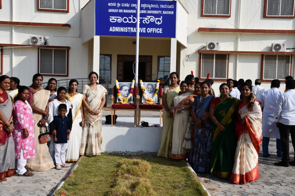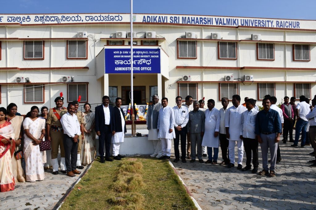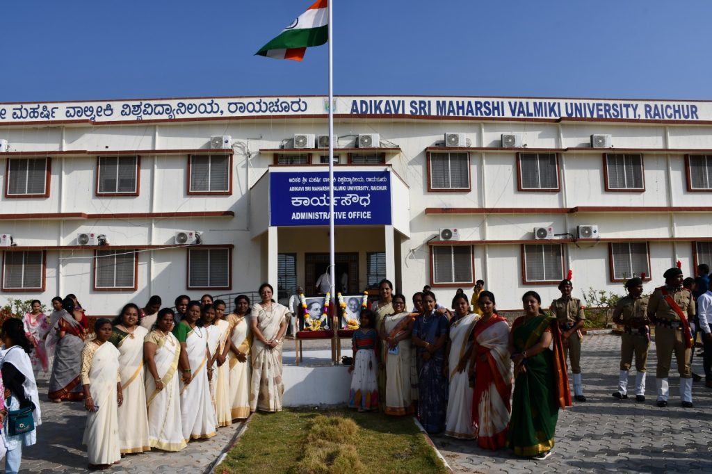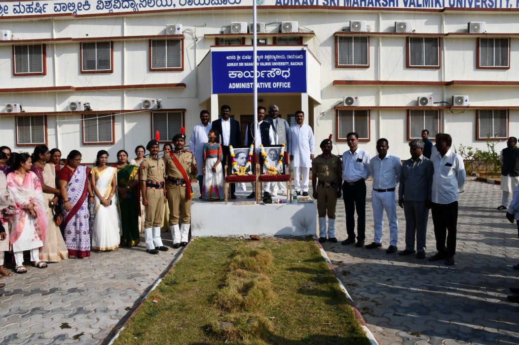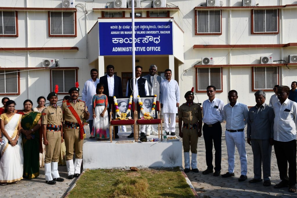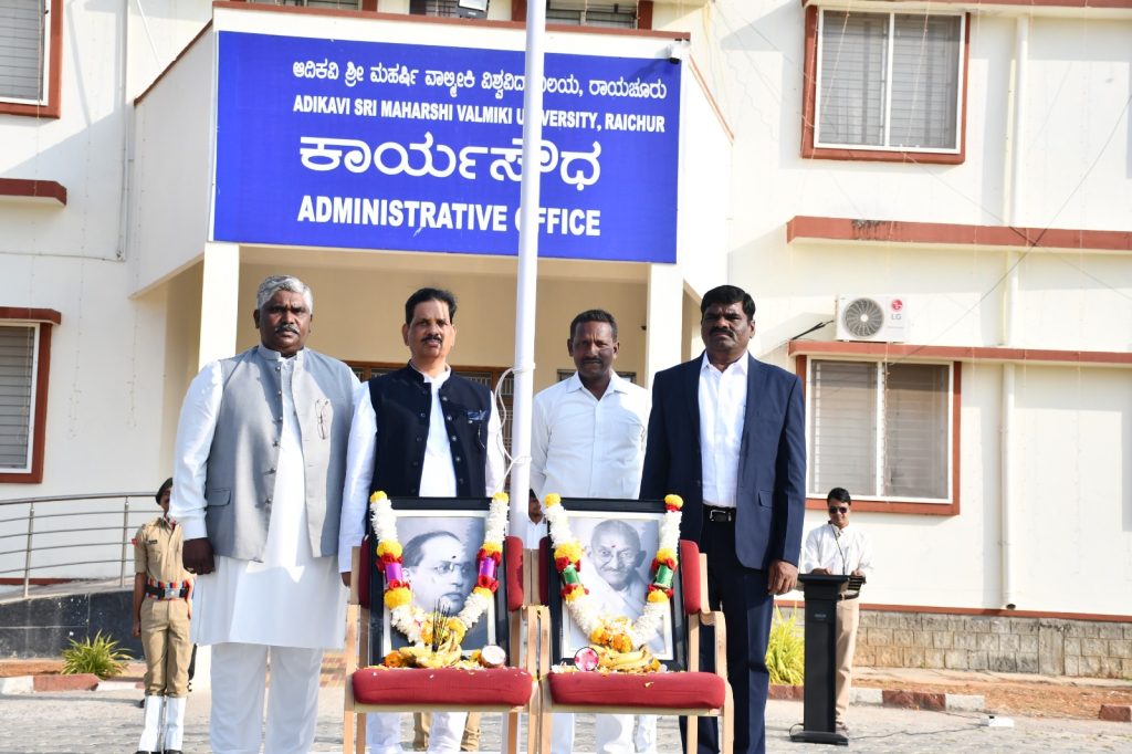 ಆದಿಕವಿ ಶ್ರೀ ಮಹರ್ಷಿ ವಾಲ್ಮೀಕಿ ವಿಶ್ವವಿದ್ಯಾನಿಲಯದ ಆಡಳಿತ ಕಚೇರಿ ಆವರಣದಲ್ಲಿ ಆಯೋಜಿಸಿದ 77ನೇ ಗಣರಾಜ್ಯೋತ್ಸವ ದಿನಾಚರಣೆ ಅಂಗವಾಗಿ ಗೌರವಾನ್ವಿತ ಕುಲಪತಿಗಳು ಪ್ರೊ. ಶಿವಾನಂದ ಕೆಳಗಿನಮನಿ ಅವರು ಡಾ. ಬಿ.ಆರ್.ಅಂಬೇಡ್ಕರ್ ಮತ್ತು ಮಹಾತ್ಮ ಗಾಂಧೀಜಿ ಭಾವಚಿತ್ರಗಳಿಗೆ ಪುಷ್ಪ ನಮನ ಸಲ್ಲಿಸಿ, ರಾಷ್ಟ್ರ ಧ್ವಜಾರೋಹಣ ನೆರವೇರಿಸಿ, ಮಾತನಾಡಿದರು.