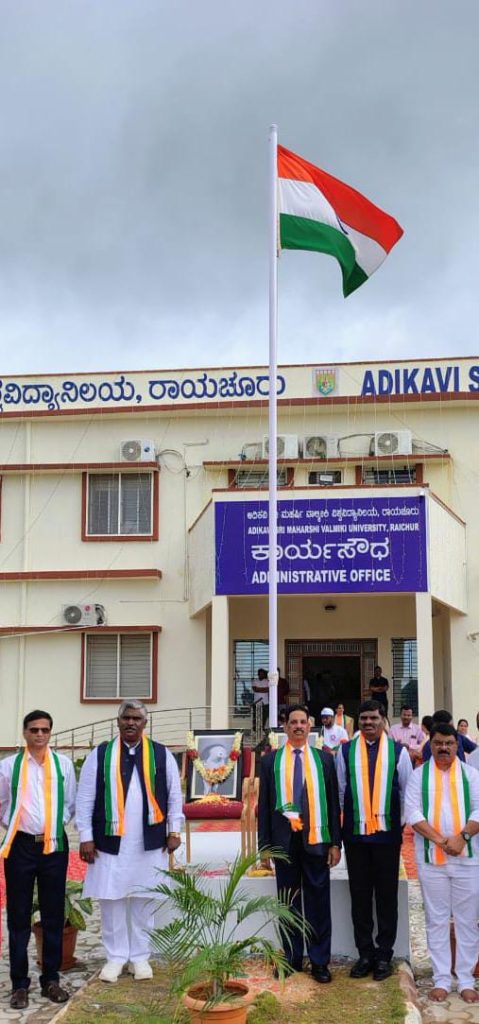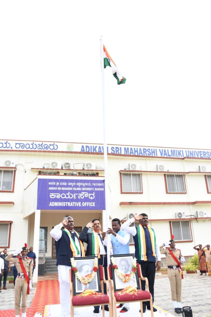 ದಿನಾಂಕ: ೧೫.೦೮.೨೦೨೫ ರಂದು ಆದಿಕವಿ ಶ್ರೀ ಮಹರ್ಷಿ ವಾಲ್ಮೀಕಿ ವಿಶ್ವವಿದ್ಯಾನಿಲಯದಲ್ಲಿ ೭೯ನೇ ಸ್ವಾತಂತ್ರ್ಯ ದಿನಾಚರಣೆಯ ಅಂಗವಾಗಿ ಕುಲಪತಿ ಪ್ರೊ. ಶಿವಾನಂದ ಕೆಳಗಿನಮನಿ ಅವರು ಧ್ವಜಾರೋಹಣ ನೆರವೇರಿಸಿ ಮಾತನಾಡಿದರು. ಕುಲಸಚಿವರಾದ ಡಾ.ಎ.ಚನ್ನಪ್ಪ ಕೆ.ಎ.ಎಸ್., ಮೌಲ್ಯಮಾಪನ ಕುಲಸಚಿವರಾದ ಡಾ. ಜ್ಯೋತಿ ದಮ್ಮ ಪ್ರಕಾಶ್, ನಿಕಾಯಗಳ ಡೀನರಾದ ಪ್ರೊ.ಪಾರ್ವತಿ ಸಿ.ಎಸ್., ಪ್ರೊ.ಪಿ.ಭಾಸ್ಕರ್, ಡಾ.ಲತಾ ಎಂ.ಎಸ್., ವಿದ್ಯಾರ್ಥಿ ಕಲ್ಯಾಣಾಧಿಕಾರಿ ಡಾ.ಜಿ.ಎಸ್. ಬಿರಾದಾರ, ದೈಹಿಕ ಶಿಕ್ಷಣ ವಿಭಾಗದ ಸಂಯೋಜಕರಾದ ಮಲ್ಲಿಕಾರ್ಜುನ್ ಎನ್. ಉಪಸ್ಥಿತರಿದ್ದರು.